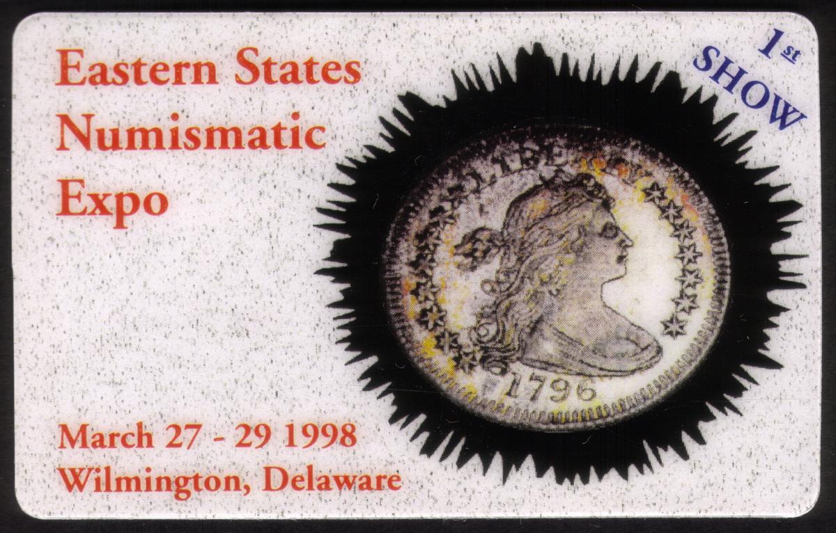 This collectible card celebrates the 5th Eastern States Numismatic Expo held in March 1998 in Wilmington, Delaware. It prominently features a detailed image of a 1796 Silver Dollar coin centered against a dark background. The card bears the inscription “5m Eastern States Numismatic Expo (03/98)” and the text “1796 Silver Dollar Card” along with “Tell-One Inc. (CCK)” in the bottom right corner. The denomination “5m” is clearly positioned in the upper left part of the card.