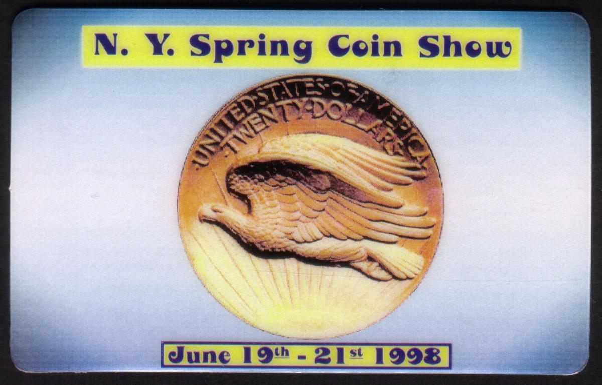 Text on the card identifies this item as related to the New York Spring Coin Show held in June 1998. The card includes references to "WorldCom" and "Tell-One Inc. (CCK)," suggesting associations with these entities. Additional text mentions birds and the coin’s $20 denomination, confirming its status as a gold coin collectible. The card’s overall presentation reflects themes of numismatics and currency collecting.