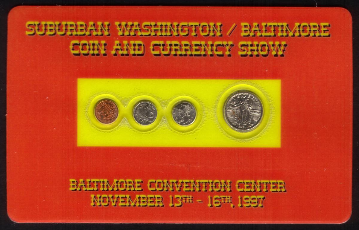 The card includes textual elements identifying it as part of the Suburban Washington / Baltimore Coin Show from November 1997. The themes of collectibles, numismatics, money, and currency are emphasized, with mentions of various coin types such as the Indian Cent, Buffalo Nickel, Mercury Dime, and Standing Liberty Quarter. The card associates with numismatists and features miniature coins, connecting to the coin show event.