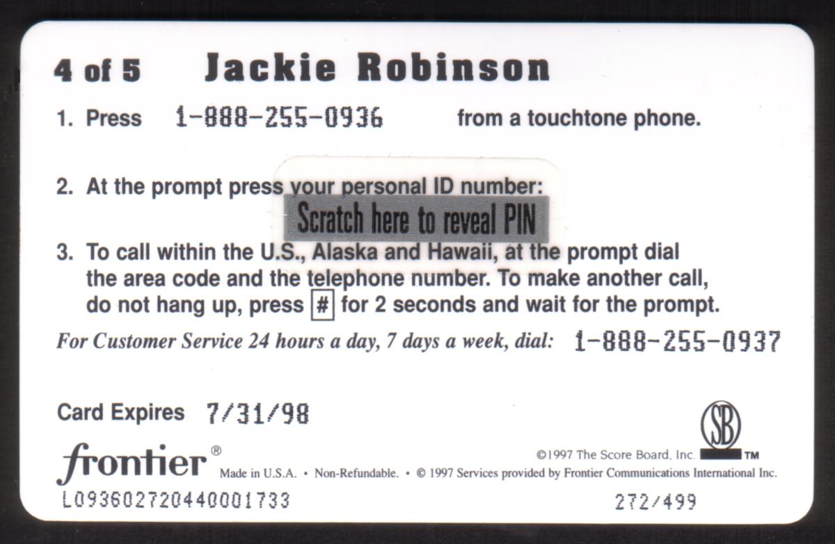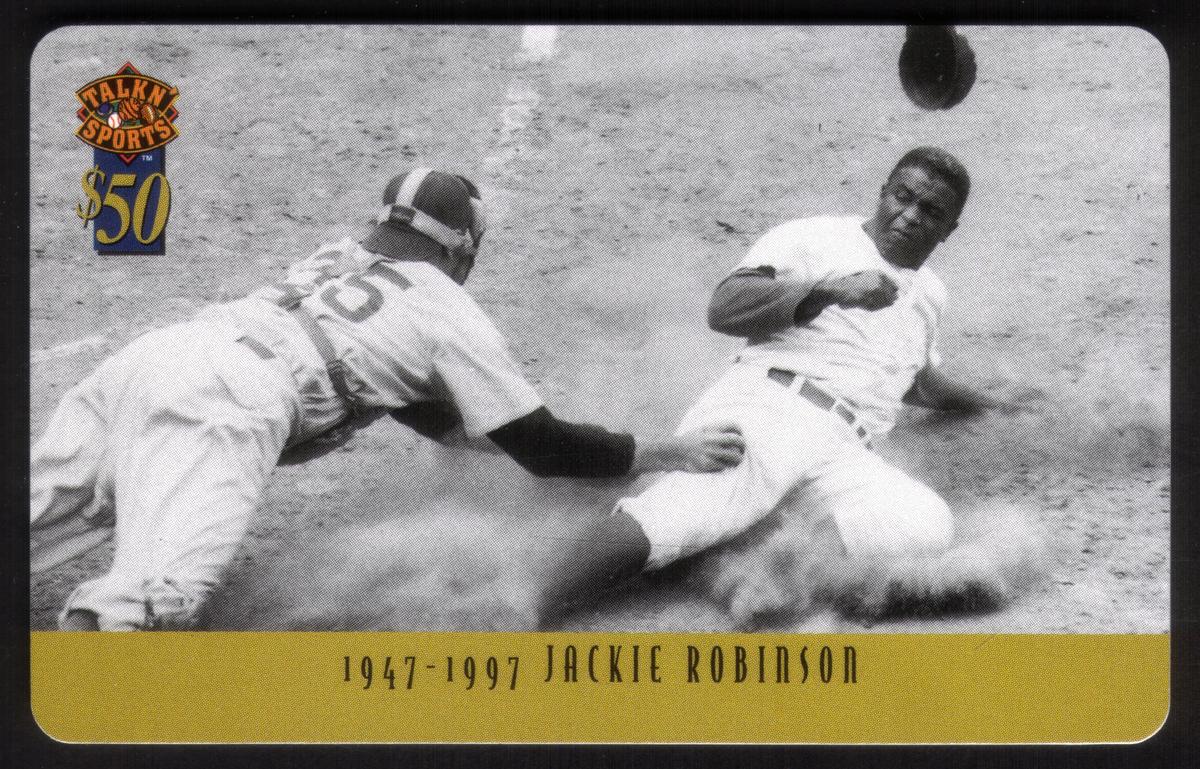 This collectible commemorates Jackie Robinson, a Major League Baseball icon known for breaking the color barrier. It is connected to the Brooklyn Dodgers and the MLB, highlighting Robinson’s historic impact on the sport between 1947 and 1997. The scene captures a memorable moment in baseball history, making this phone card a valuable piece for collectors and fans alike.