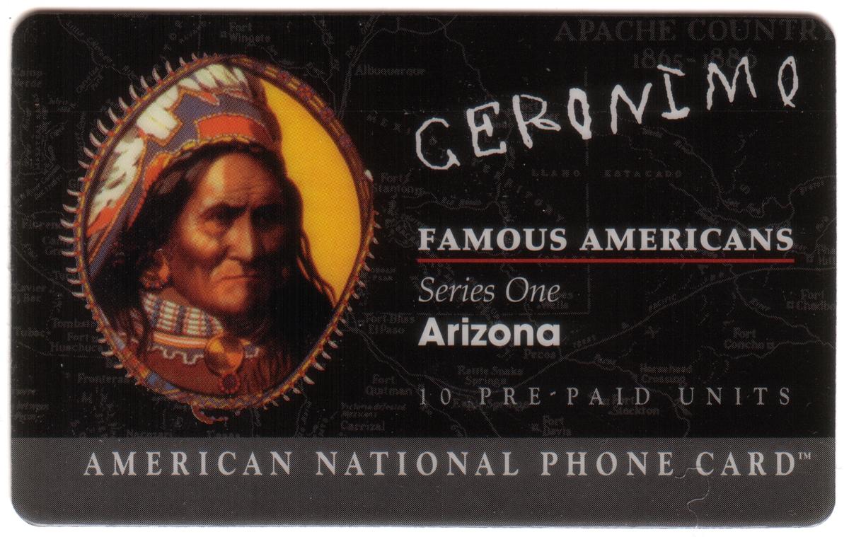 Issued with 10 prepaid units, this phone card also serves as a cultural artifact from the era of collectible phone cards, which popularized historical figures through everyday items. Produced by Frontier Communications and branded as a Phonecard Express American National Phone Card, it transcends its telecommunication purpose to become a piece of Americana celebrating iconic Native American leaders. It appeals to collectors interested in American history, indigenous culture, and vintage telecommunication memorabilia. The clear "Famous Americans" branding and Arizona focus place Geronimo among a distinguished group of figures who shaped the American West and its cultural identity.