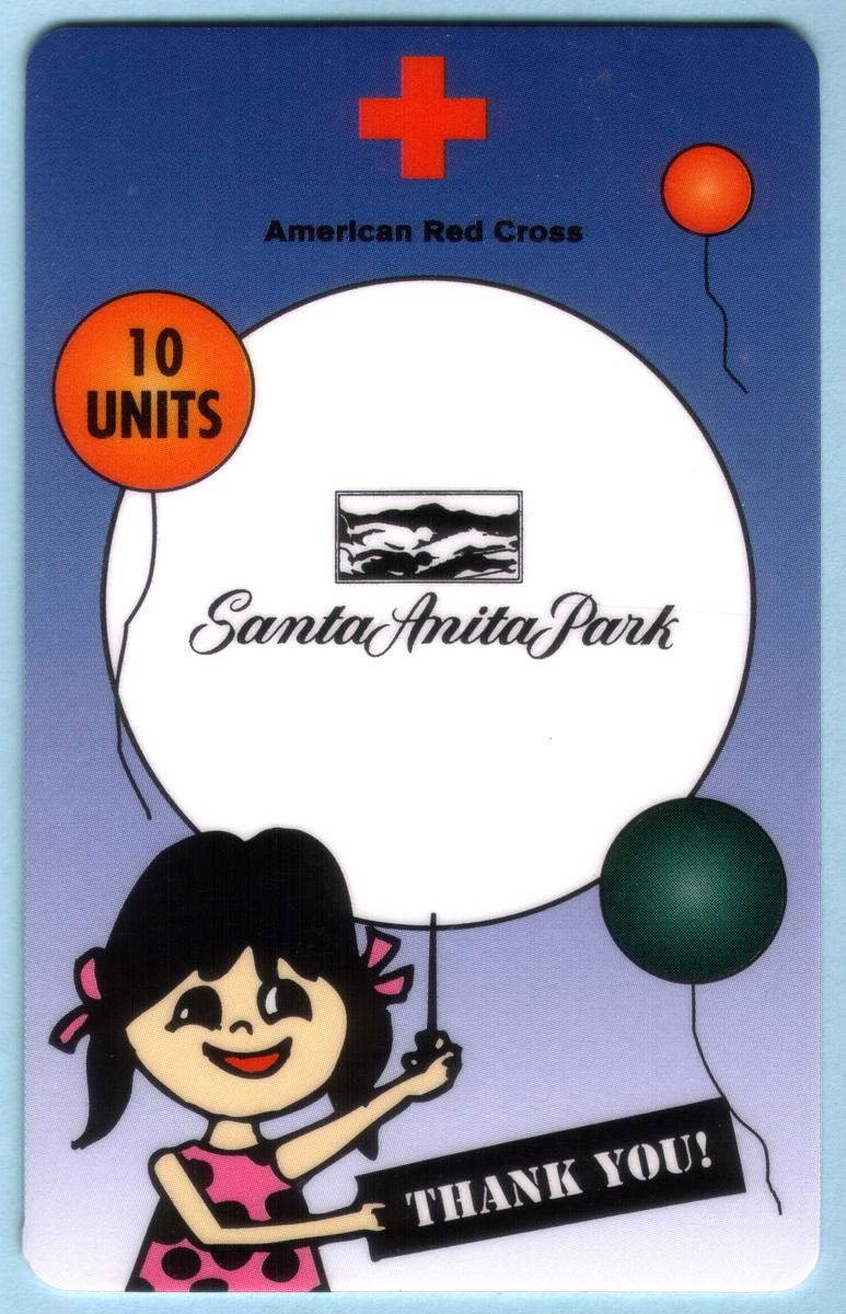 This card is a collectible phone card that commemorates community and charitable involvement in Southern California, particularly highlighting the partnership between nonprofit causes and regional events such as the Arcadia Open Air Festival and activities at Santa Anita Park. The imagery and text together emphasize local pride and support for organizations like the American Red Cross without additional decorative graphics beyond these key references.