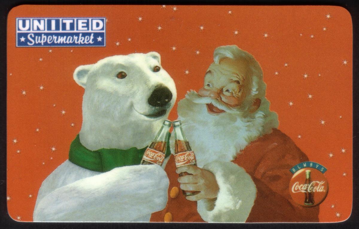 This collectible phone card features a colorful festive scene with Santa Claus, the traditional St. Nick figure, and a polar bear toasting with Coca-Cola bottles. Both characters hold glass bottles of Coke, symbolizing the iconic beverage brand. The card prominently displays multiple Coca-Cola and Coke logos across the design, emphasizing the famous soda company’s branding. The artwork highlights a warm holiday atmosphere that connects the brand with Christmas celebrations.