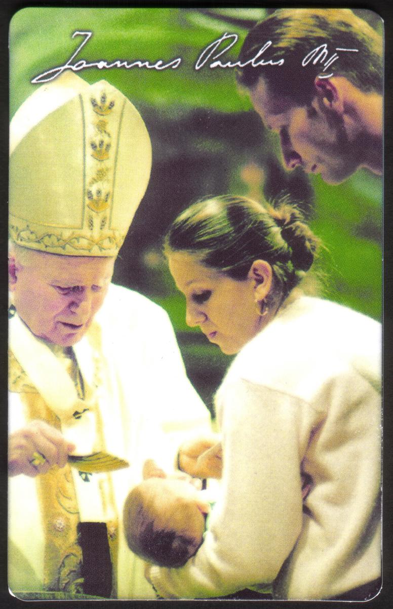 This collectible phone card features a color photographic image of Saint John Paul II baptizing a child. The photograph captures Pope John Paul II dressed in his papal white robes, holding the infant over a baptismal font, with the child's parents standing closely beside him. The setting appears to be indoors, likely within a religious or Vatican environment, given the presence of religious artifacts and symbols in the background.
