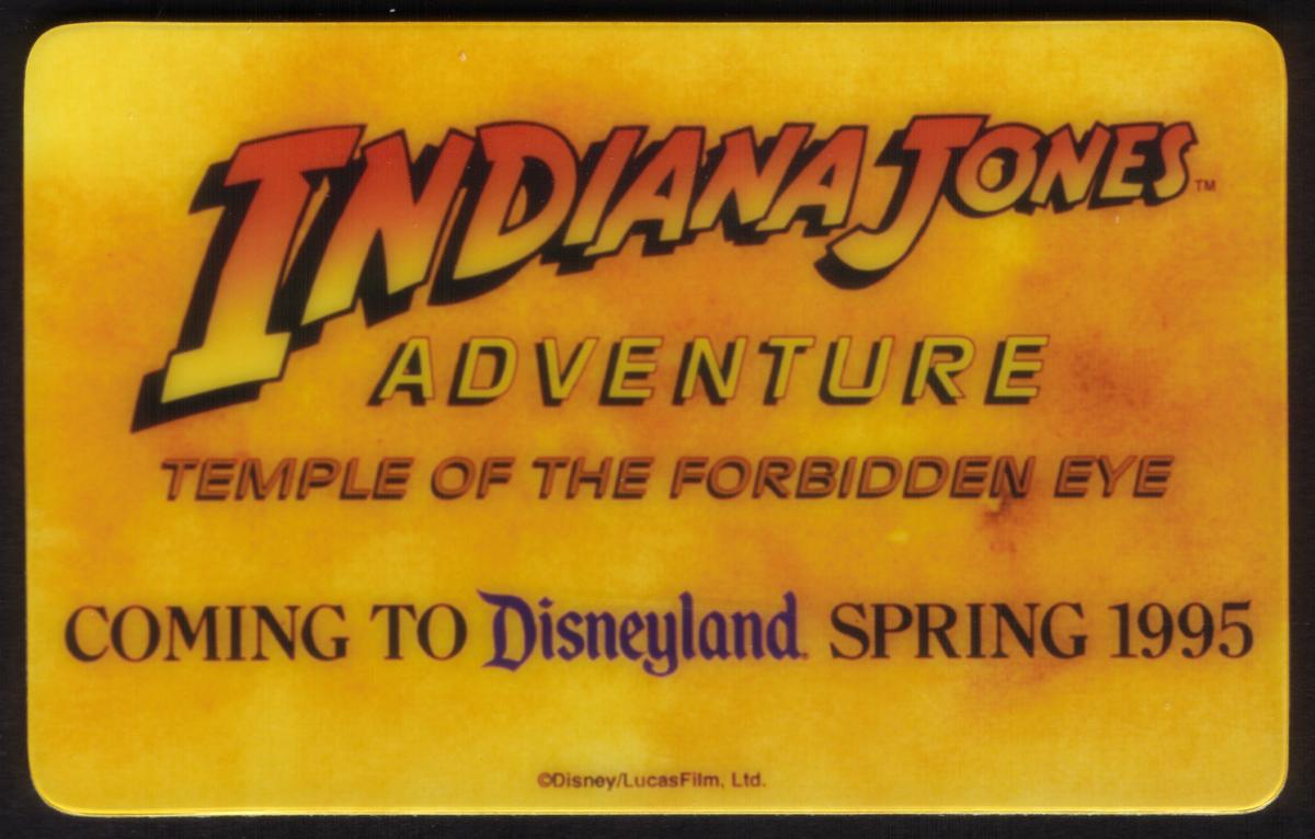 This collectible phone card features a vibrant announcement for the highly anticipated Indiana Jones Adventure: Temple of the Forbidden Eye, set to debut at Disneyland in Spring 1995. The background displays a rich gradient of warm yellows and oranges, reminiscent of dusty desert landscapes that capture the adventurous spirit of the Indiana Jones franchise. Dominating the upper half of the card is the bold "Indiana Jones" title, rendered in a classic stylized font reminiscent of the iconic movie logo, blending deep red and bright yellow hues. Beneath it, the word "ADVENTURE" is printed in a strong, angular typeface, immediately conveying excitement and action. The subtitle, “Temple of the Forbidden Eye,” subtly hints at the mysterious and perilous journey awaiting riders, directly connecting to Indiana Jones lore and the thrilling atmosphere of the film series.