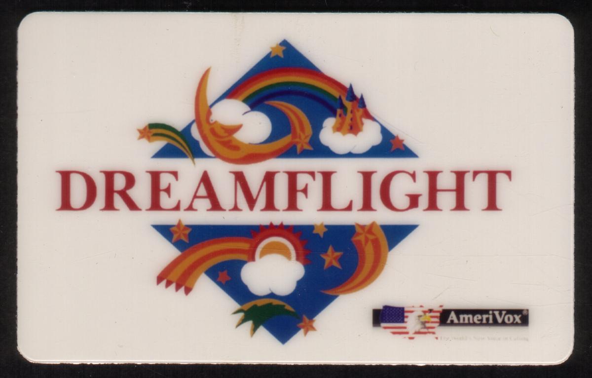 The card is marked as a PROOF edition and bears the name AmeriVox, indicating the issuer. The Dreamflight Charity phone card supports non-profit initiatives and reflects its purpose through the joyful and imaginative artwork. The entire front surface is dedicated to this bright and uplifting imagery without additional text or logos aside from the card’s title and issuer information.