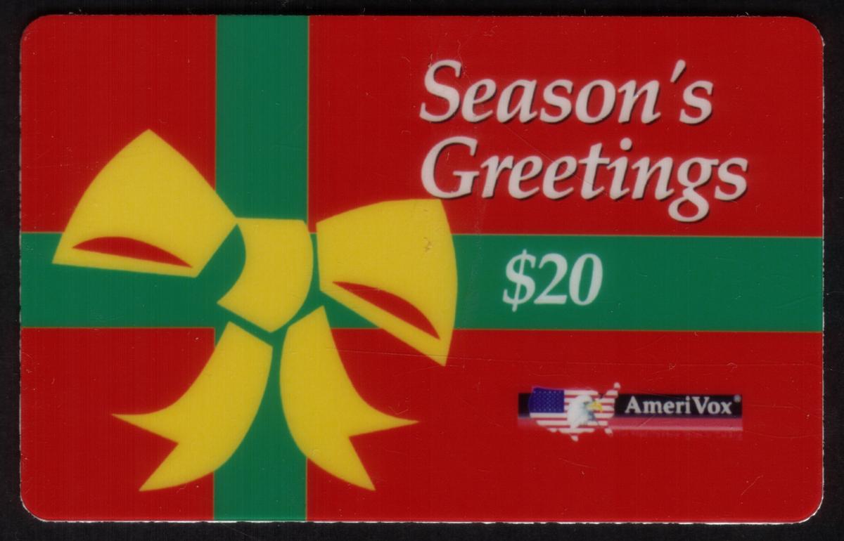 The card is marked with the brand name AmeriVox, indicating its origin. The coloration includes rich reds complementing the green ribbon and yellow bow, enhancing the classic Christmas color scheme. The card does not contain any numeric values or identification numbers on the front, and it is identified as a proof issue.