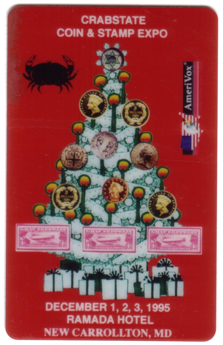 Festive 1995 Crabstate Coin & Stamp Expo card featuring a Christmas tree decorated with historic coins, stamps, and holiday motifs, highlighting numismatics and philately. |