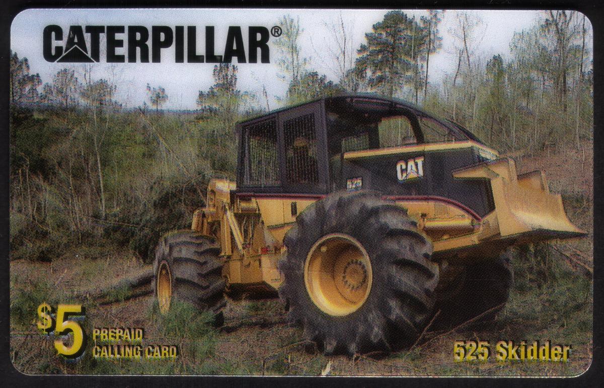 This collectible $5 chip card features heavy equipment from Caterpillar, specifically showcasing the 525 Skidder model. The card highlights the earthmoving and transportation industry, with a detailed image of the Caterpillar 525 Skidder, an earthmover machine used in forestry and land clearing. The machine is prominently positioned, emphasizing the robust design and functionality of this heavy equipment.