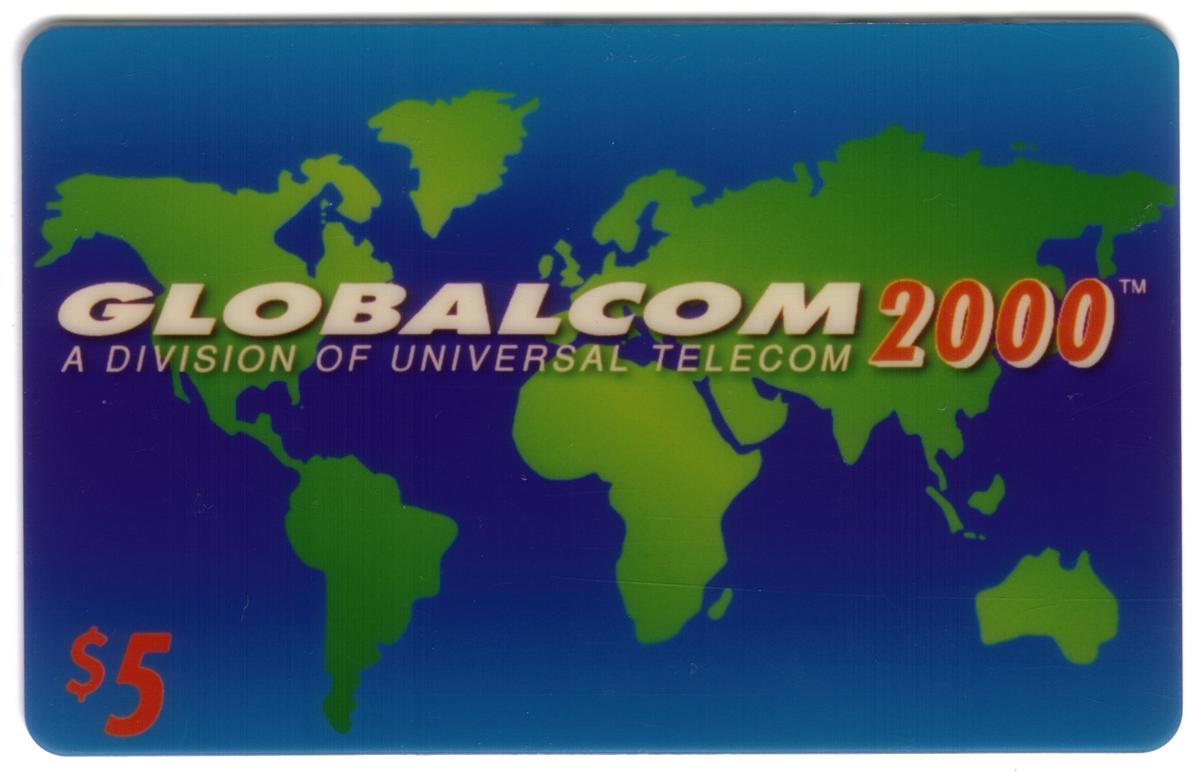 This collectible phone card features a world map design with continents in shades of green against a blue background. The card prominently displays the text "GLOBALCOM 2000" in large white and red lettering across the center. Below this, in smaller white text, it reads "A DIVISION OF UNIVERSAL TELECOM." The value of the card, "$5," appears in red in the bottom left corner.