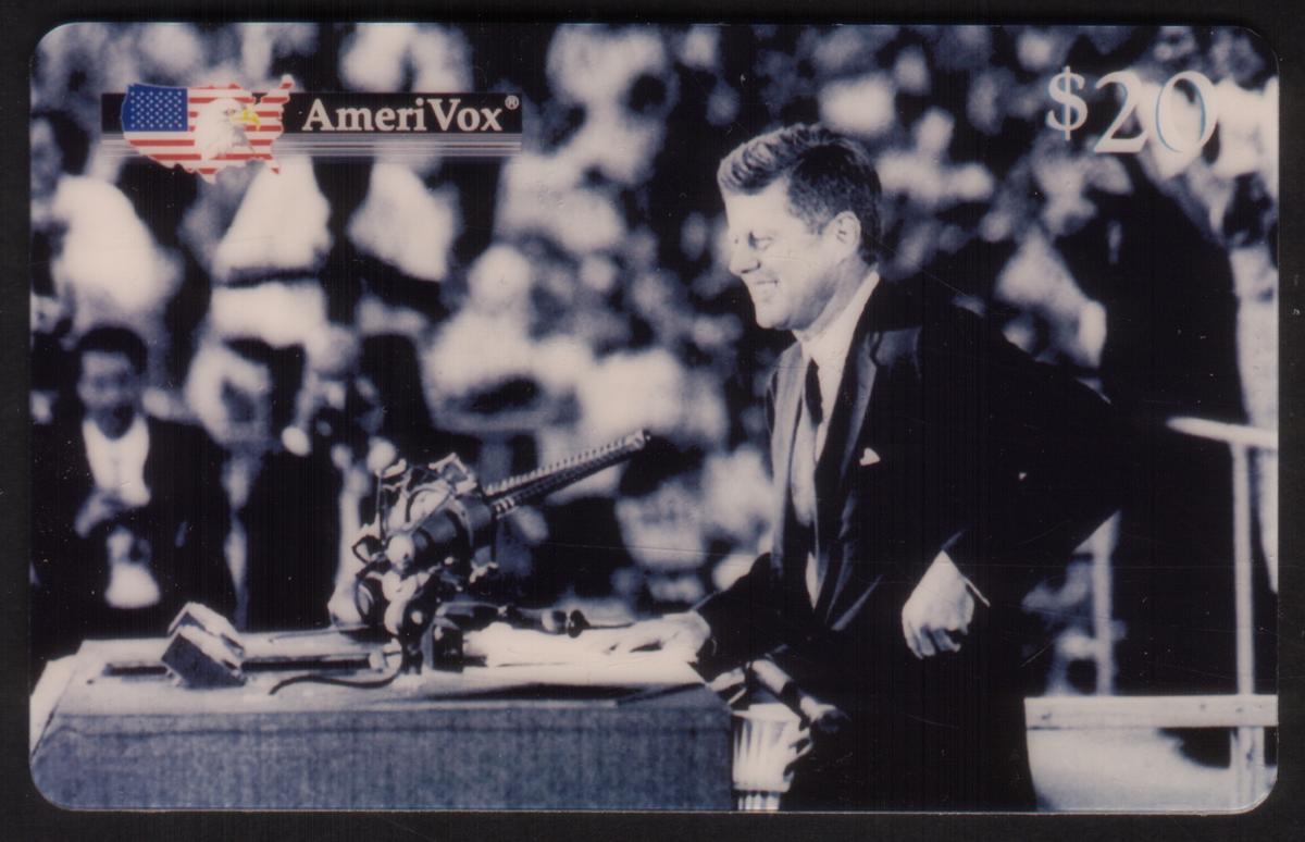 The card is issued by AmeriVox and has a $20 denomination. It connects strongly to American political history, commemorating John F. Kennedy’s impact on the nation, with an emphasis on his political campaigns and election as a US President during a transformative period in American history. The overall design and wording prioritize JFK's political legacy and significance.