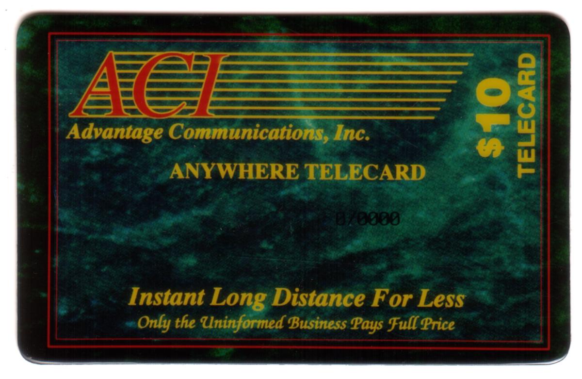 This collectible phone card is an Advantage Communications, Inc. Anywhere Telecard with a $10 value, identified as a green prototype. The card prominently features the ACI logo in large red and yellow font near the top left corner, with "Advantage Communications, Inc." written below it in yellow. Centered on the card is the text "ANYWHERE TELECARD" in yellow capital letters, and beneath that, a serial number "610000" printed in black.