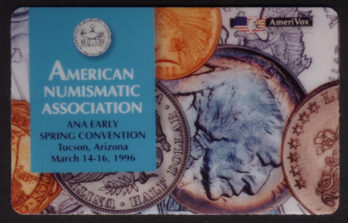 This collectible phone card from Amerivox features a design commemorating the American Numismatic Association (ANA) Early Spring Convention held in Tucson, Arizona, in March 1996. The card prominently displays the iconic image of a Buffalo nickel, also known as the Indian Head nickel, on its face. The buffalo and Native American profile are central to the design, linking the card to themes of coin collecting and numismatics.