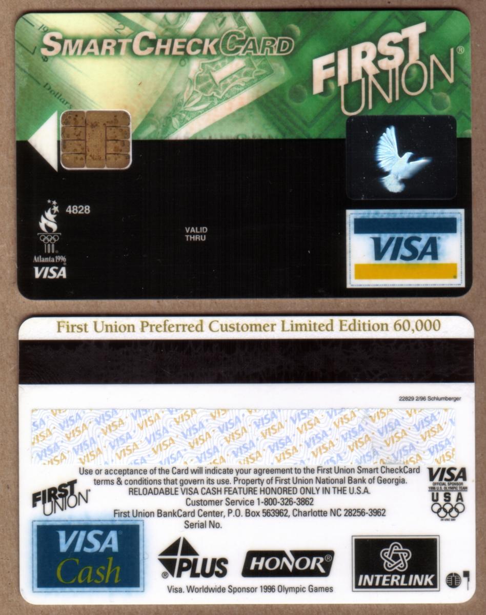 This collectible item is a First Union Corp. Bank Visa Cash Card issued in February 1996. It features a chip with a toned finish and incorporates both chip and magnetic stripe technology. The card is part of the SmartCheck Card series, known for being reloadable bankcards, combining electronic payment convenience with secure chip functionality.