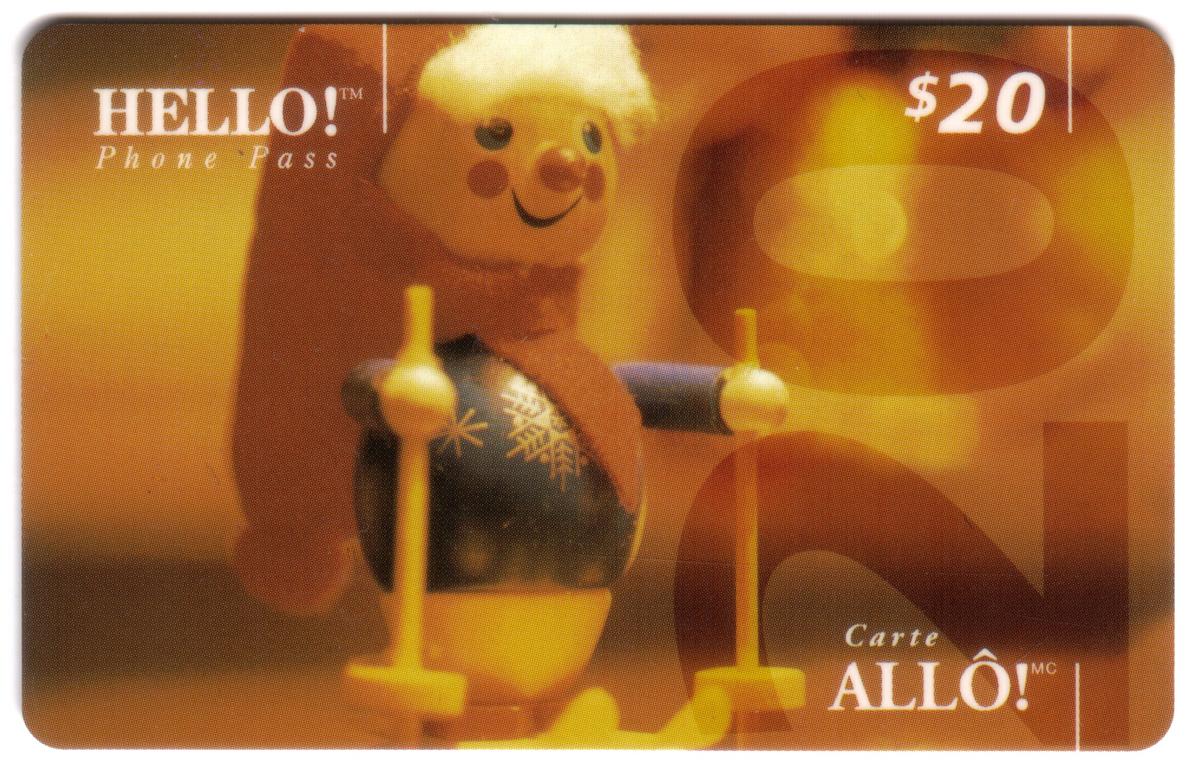 Overall, the card combines Canadian holiday imagery with a distinctive wooden skier doll motif. The details of the doll’s winter clothing and equipment highlight the traditional winter pastime, making this collectible phone card a unique memento of Christmas in Canada.