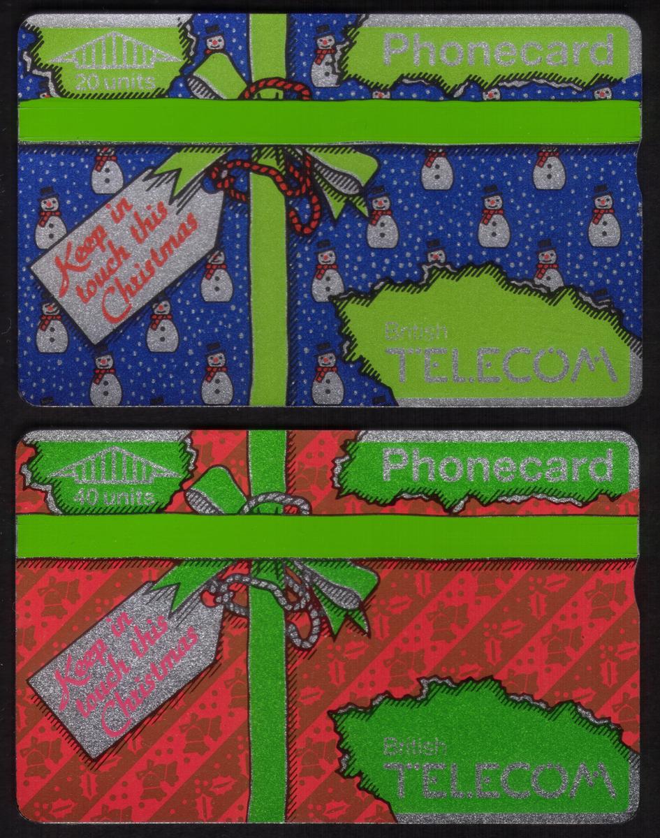 Celebrate holiday nostalgia with vintage British Telecom 1988 Christmas phone cards, featuring festive motifs, vibrant colors, and a classic connection theme. |