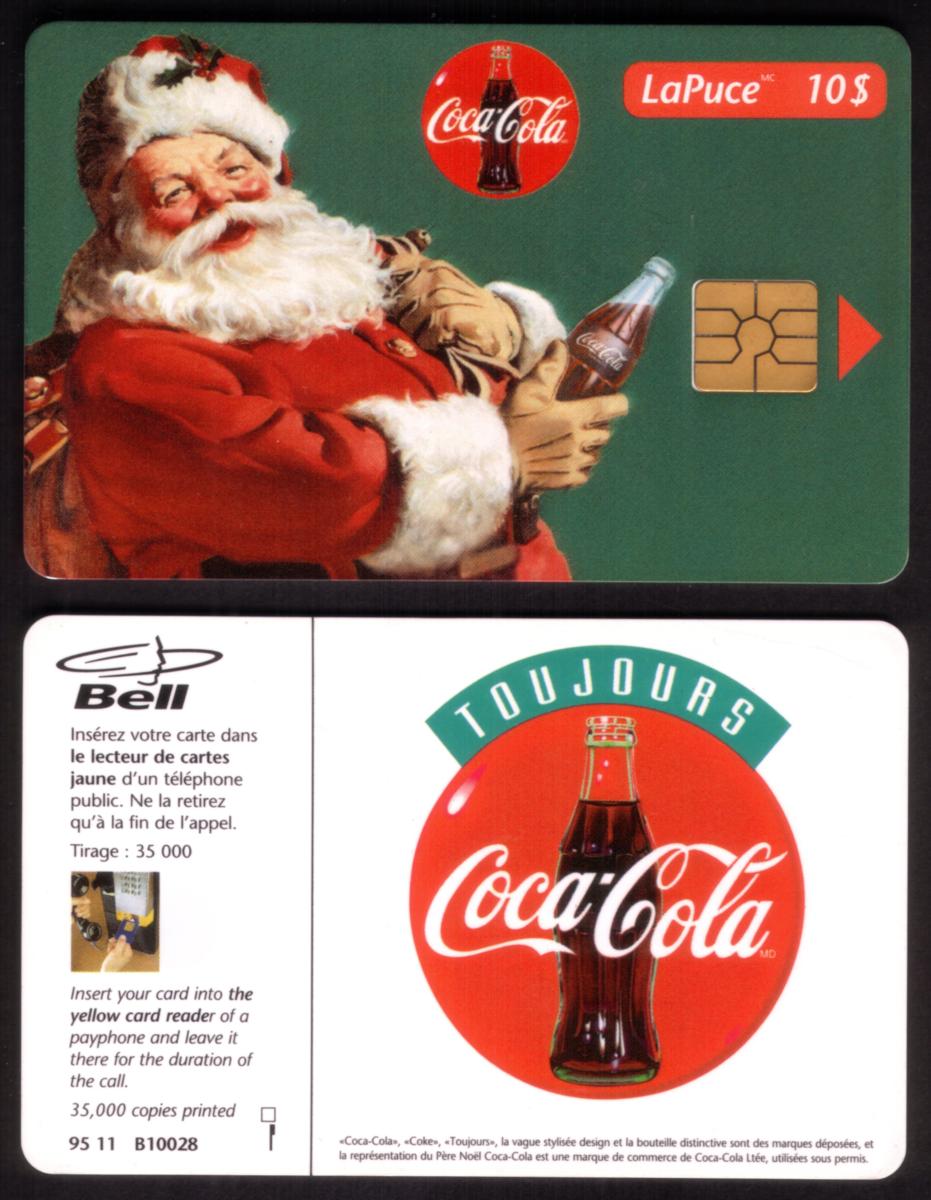 The card is issued by Bell and is associated with the LaPuce chip card system. It is a stored value card with a $10 denomination, indicated by the printed value “B10028 $10” on the card. The combination of Coca-Cola branding and Bell’s telecommunication service provides a clear connection between the collectible nature of the card and its functionality as a phone or stored value card. The design maintains a bright and cheerful color scheme dominated by red and white, emphasizing the holiday and Coca-Cola branding.