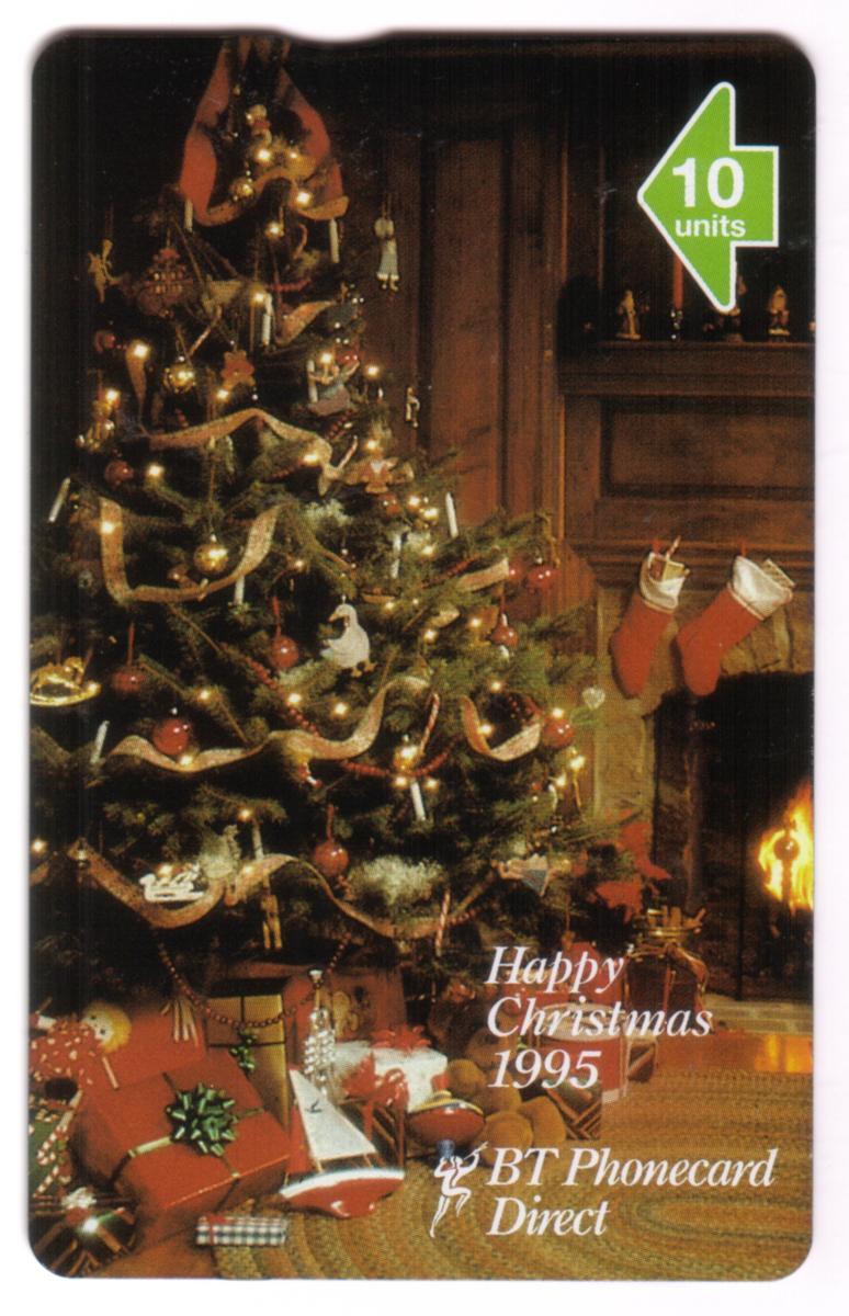 This collectible phone card from Great Britain features a festive Christmas design themed around the holiday season of 1995. The main image depicts a traditional Christmas fireplace scene, complete with stockings hanging on the mantle and a cheerful Christmas tree decorated for the occasion. The card includes the greeting "Happy Christmas 1995" in a clear and prominent font, reflecting the card’s use as a seasonal item. The setting is warm and inviting, emphasizing classic holiday motifs such as the fireplace, stockings, and decorated tree.